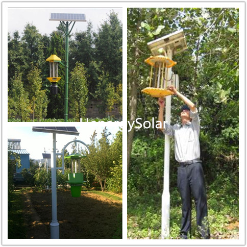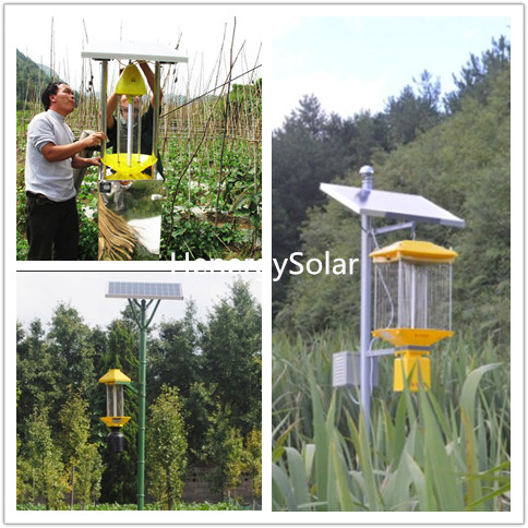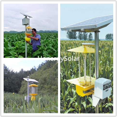 太陽能光伏防蟲害系統是利用太陽能電池板作為用電來源,其將白天太陽能發的電貯存起來,晚上放電給殺蟲燈具,供其工作。太陽能光伏防蟲害系統是利用365±50nm波長紫外光對昆蟲具有激備較強的趨光、趨波、趨色、趨性的特性原理,確定對昆蟲的誘導波長,研制專用光源,利用放電產生的低溫等離子體,紫外光輻射對害蟲間生的趨光興奮效應,引誘害蟲撲向燈的光源,光源外配置高壓擊殺網,殺死害蟲,使害蟲落下專用的接蟲袋內,達到滅殺害蟲的目的。