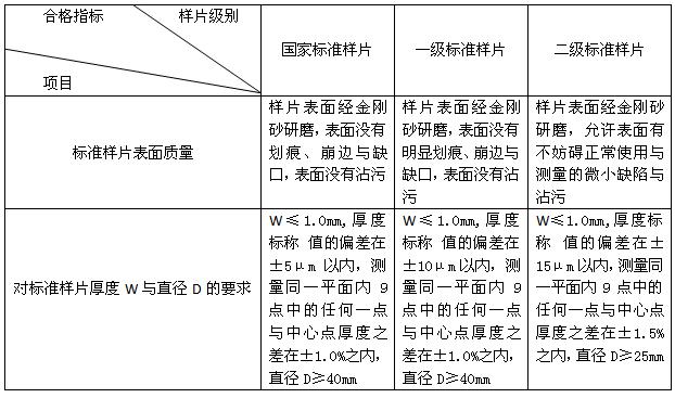 硅單晶電阻率標準片(以下簡稱標準樣片)是用高純多晶硅,經過單晶設備,再經中子嬗變摻雜等多種工藝制造的,具有一定幾何尺寸的實物標準.由不確定度已知的標準裝置,對該實物標準的電阻率及其他指標給予標定,使用時以標準樣片為準,對相關參數進行量值傳遞. 標準樣片的各項指標要求: 標準樣片的表面質量及幾何尺寸: