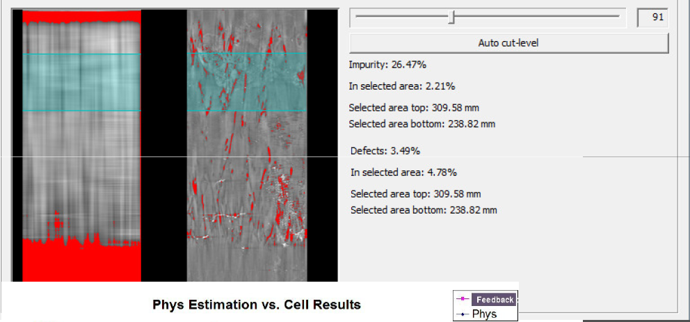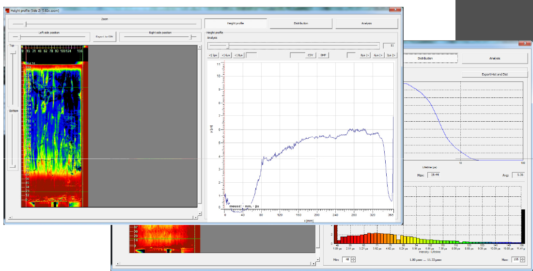 PL光致發光檢測模式中,集成了用戶通常檢測所需的少子檢測、彩色掃描標定(color maps)、柱狀圖分布等。另外硅塊掃描檢測的缺陷百分比和雜質百分比計算分析將為硅片生產效率的提升提供重要支撐。