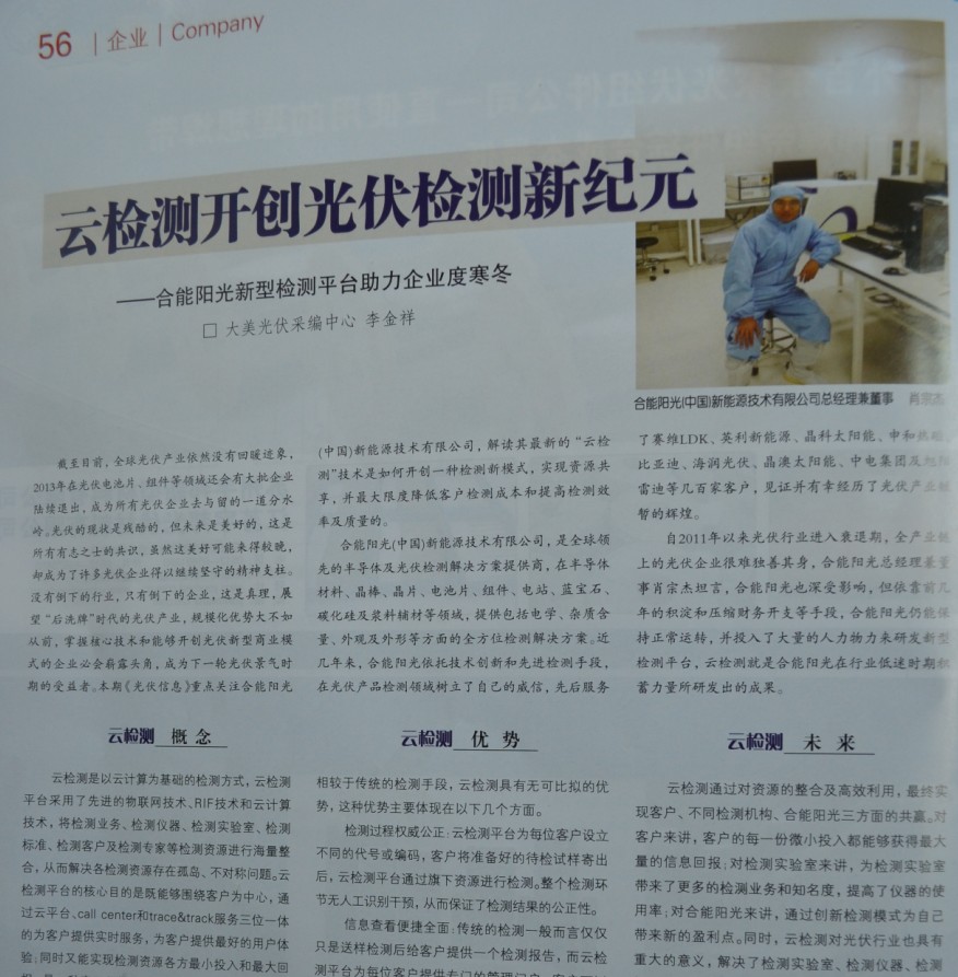 截至目前,全球光伏產(chǎn)業(yè)依然沒有回暖跡象,2013年在光伏電池片、組件等領(lǐng)域還會有大批企業(yè)陸續(xù)退出,成為所有光伏企業(yè)去與留的一道分水嶺。光伏的現(xiàn)狀是殘酷的,但未來是美好的,這是所有有志之士的共識,雖然這美好可能來得較晚,卻成為了許多光伏企業(yè)得以繼續(xù)堅守的精神支柱。沒有倒下的行業(yè),只有倒下的企業(yè),這是一個真理,展望“后洗牌”時代的光伏產(chǎn)業(yè),規(guī)?;瘍?yōu)勢大不如從前,掌握核心技術(shù)和能夠開創(chuàng)光伏新型商業(yè)模式的企業(yè)必會嶄露頭角,成為下一輪光伏景氣時期的受益者。本期《光伏信息》重點關(guān)注合能陽光(中國)新能源技術(shù)有限公司,解讀其最新的“云檢測”技術(shù)是如何開創(chuàng)一種檢測新模式,實現(xiàn)資源共享,并最大限度降低客戶檢測成本和提高檢測效率及質(zhì)量的。