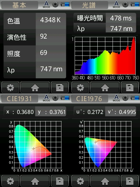 在Simple(簡要)模式下,直接讀取CCT(相關色溫)、CRI(顯色指數)、LUX(照度)、λP(主峰波長)。