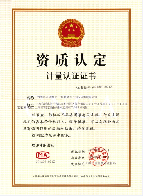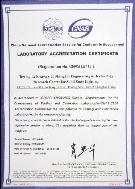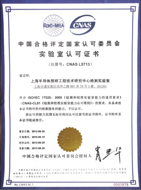 上海半導(dǎo)體照明工程技術(shù)研究中心檢測實驗室於2012年5月22日獲得中國計量認(rèn)證CMA資質(zhì);於2012年6月20日正式獲中國合格評定國家認(rèn)可委員會(CNAS)檢測實驗室能力認(rèn)證(注冊編號:L5713)。