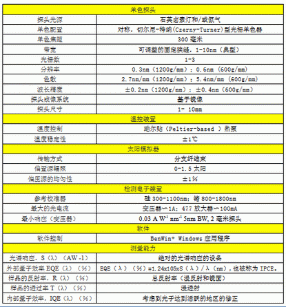 太陽能電池光譜響應測試,或稱量子效率QE(Quantum Efficiency)測試,或光電轉化效率IPCE (Monochromatic Incident Photon-to-Electron Conversion Efficiency) 測試等,配備可選的集成范圍,還能夠測量內部量子效率(IQE),以及對反射系數和透射比進行采樣。廣義來說,就是測量光電材料的光生電流特性在不同波長光照條件下的數值。